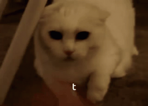 A white T Cat Draker Cat hisses at the camera, with the letter 't' displayed on screen.