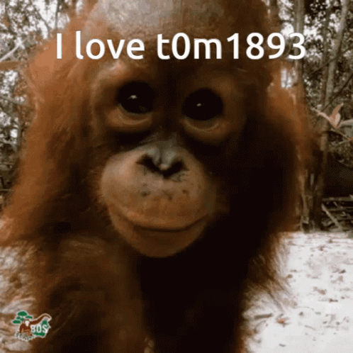 An adorable orangutan looks at the camera with the text 'I love t0m1893' overlaid on the video.