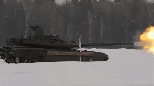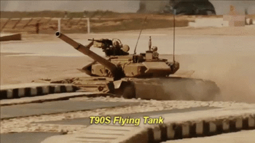 A powerful T90S tank demonstrates its agility by launching into the air over a ramp, creating a 'flying tank' spectacle.