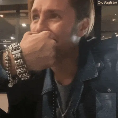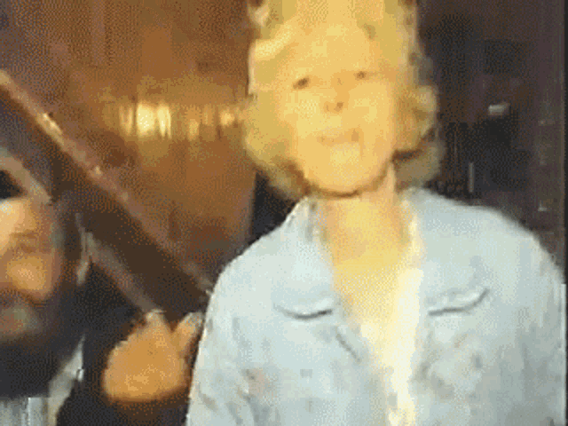 An older woman with blonde hair dances energetically in a light blue denim jacket, moving to the rhythm of 'Ta Kette Aime Ta Kette'.