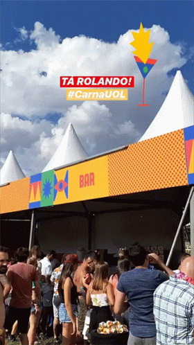 Crowd enjoying the CarnaUOL festival at an outdoor bar tent, with vibrant decorations and a festive atmosphere.