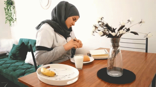 Ikram El Gat enjoying her morning breakfast, drinking milk and eating a banana at the table.
