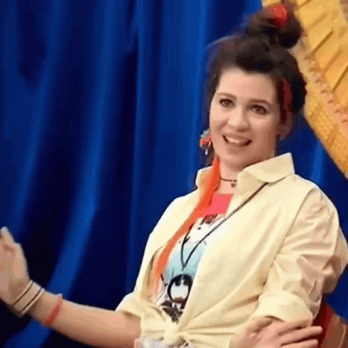 Burcu, from Güldür Güldür, reacts expressively with animated hand gestures and a wide smile in front of a blue curtain.