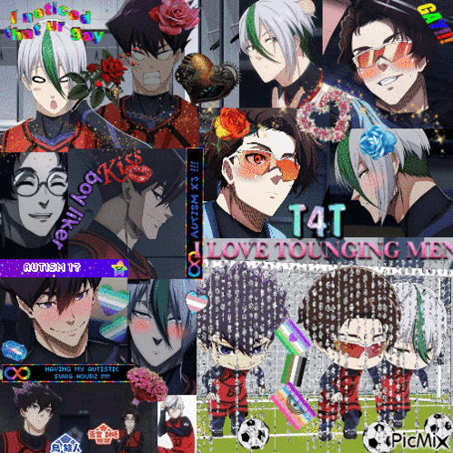 Blue Lock anime character collage featuring Tabieitaken Yukimiya, Eita Otoya, Karasu Tabito, and Kenyu Yukimiya, with 'T4T' and 'I LOVE YOUNG MEN'.