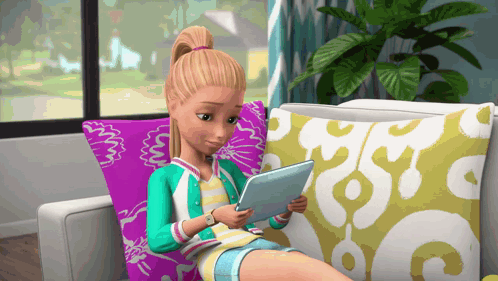 Barbie's Stacy is on the couch with her tablet, and a cute puppy rolls over next to her.