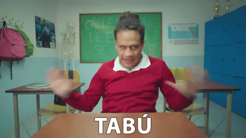 Man in red sweater with a stern expression, hands raised, emphasizing 'TABÚ' (Taboo) in a classroom setting.