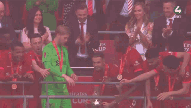 Liverpool players celebrate winning the Emirates FA Cup 2022, lifting the trophy amidst red confetti.