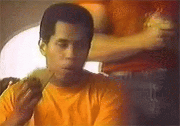 A man in an orange shirt takes a bite of a Taco Bell taco and reacts with an expressive look.