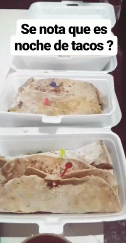 Multiple styrofoam containers filled with tacos, asking if it's clear it's taco night.