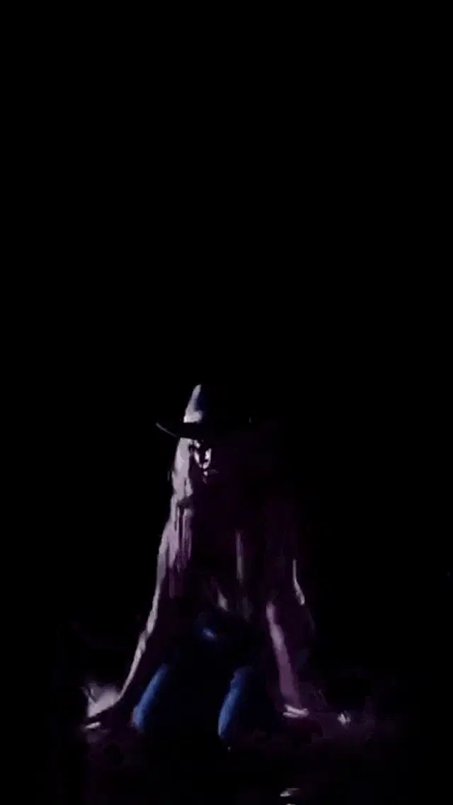 Jade Bird performs a 'tada' gesture with arms extended in a unique, black and white stylized church setting.