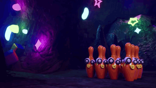 Jax, a character from The Amazing Digital Circus, bowls a spare in a neon-lit cave.