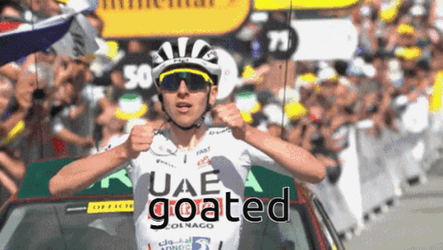 Tadej Pogačar celebrates his 'goated' win at the Tour de France, pumping his fists.