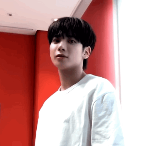 Taehyun, also known as Tyunnie, looks upset or disappointed while standing in front of a red wall.