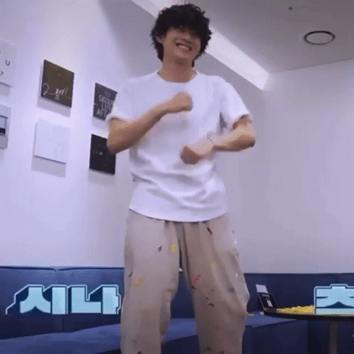 Taehyung shows off his joyful and energetic dance moves in a room with a blue couch and framed artwork.
