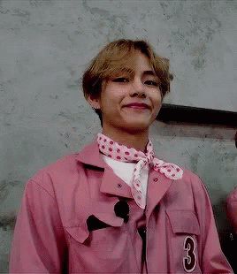 Kim Taehyung of BTS smiling and making a peace sign, wearing a pink jacket and polka dot scarf.