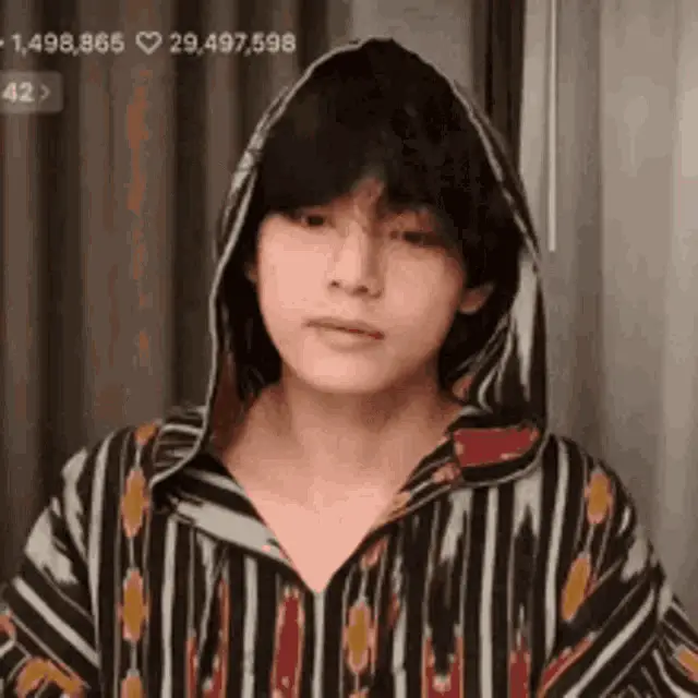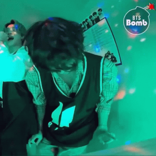 Taehyung (V from BTS) dances energetically in a room with purple and green lighting, wearing a BTS jersey.