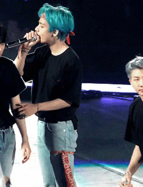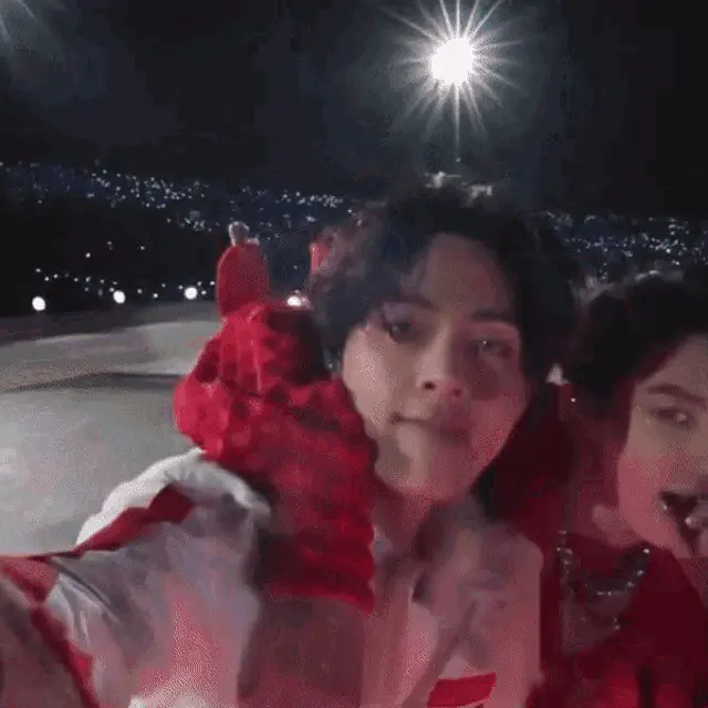 Close-up of BTS member V (Taehyung) on stage, wearing a sparkling jacket and microphone headset.