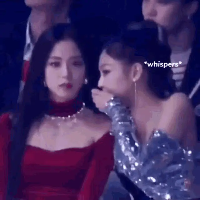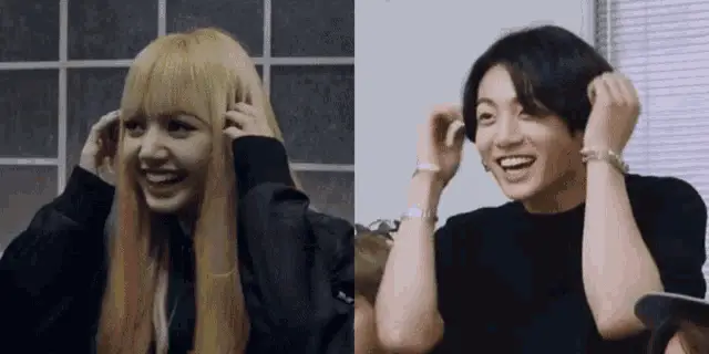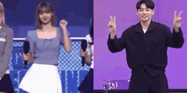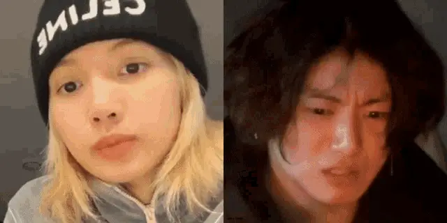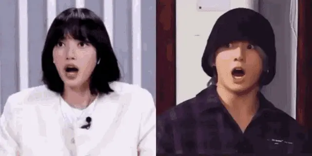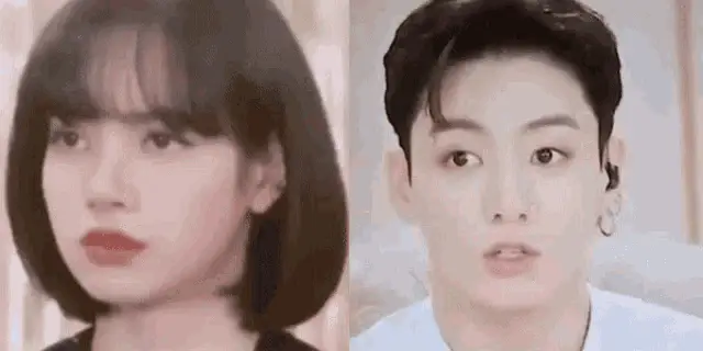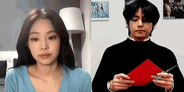 Lisa from Blackpink is seen staring at Taehyung from BTS, who is wearing a red jacket.