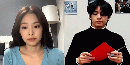 Jennie and Taehyung (V) are seen together, with Jennie looking on as Taehyung holds a red card.