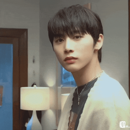 Taesan from Boy Next Door winks charmingly at the camera, wearing a light cardigan and necklace.