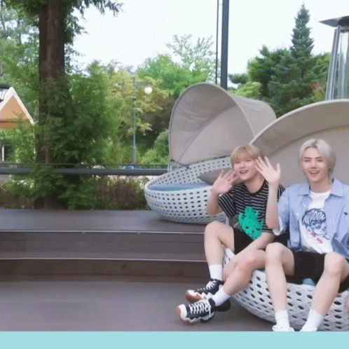 Cravity members Taeyoung, Minhee, and Woobin smile and wave from outdoor lounge chairs.