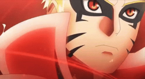 Naruto Uzumaki in his powerful Nine-Tails Baryon Mode, with glowing red eyes and a fierce expression.