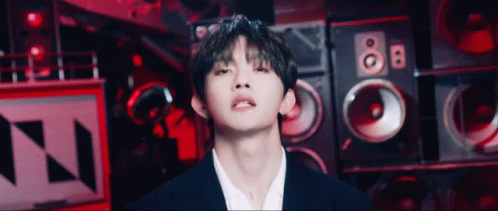 Tajima Shogo from INI performs, making a 'call me' gesture with 'I'm gonna Call the 119' text, in front of large speakers.