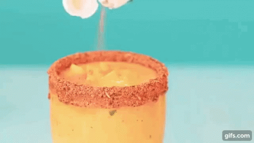 Refreshing Tajin mango drink, garnished with chili-lime seasoning and served with a straw.