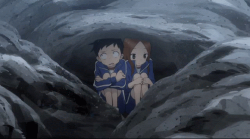 Takagi-san and Nishikata are seen huddled together in a cave, looking scared and cold.