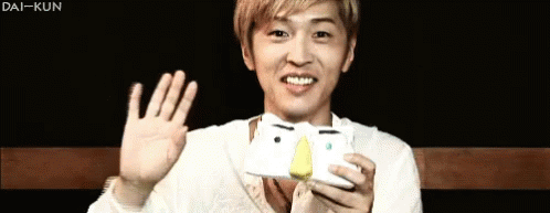 Takahiro Sakurai waves and smiles brightly while holding a white and yellow object, engaging with the camera.