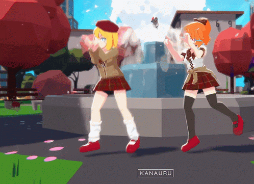 two anime girls are dancing in front of a fountain with kanauru written on the bottom right