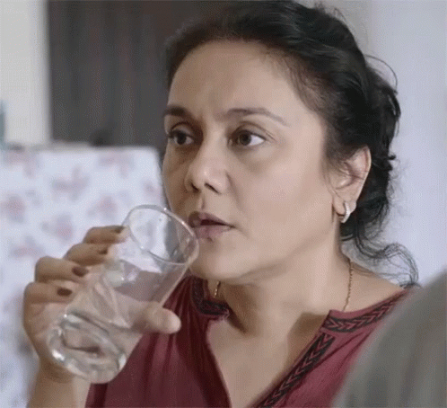 Deepika Deshpande Amin takes a deep breath while drinking water, looking surprised and worried.