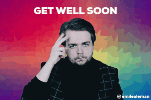 A man points and then makes a fist, conveying a "Get Well Soon" message on a rainbow background.