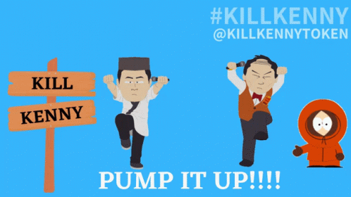 South Park characters Mr. Miyagi and Mr. Kim performing martial arts moves with Kenny, promoting the #KILLKENNY token.