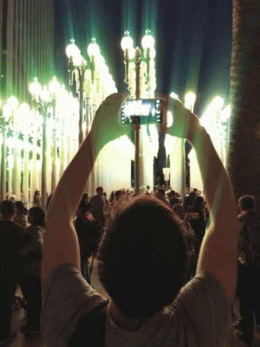 A person holds up a smartphone to take a picture of a crowd at a brightly lit outdoor event.