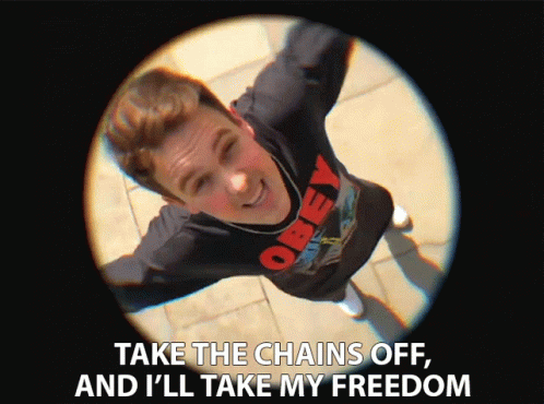 Man in an Obey shirt looks up, arms outstretched, declaring 'Take the chains off, and I'll take my freedom.'