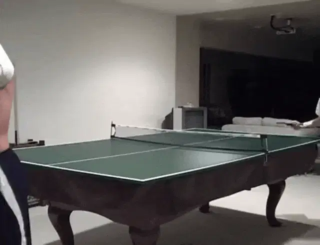 A man playing ping pong with the text 'TAKE THIS!' displayed, showing a determined expression.