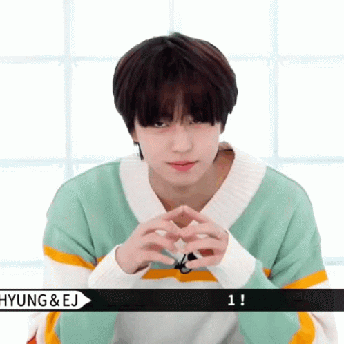 Hyung & EJ in a striped sweater making a heart shape with hands during Taki Taki Andaudition.