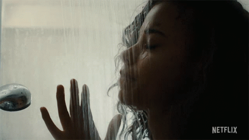 Jade Wesker, portrayed by Ella Balinska, takes a shower, with water cascading over her in a dimly lit scene.