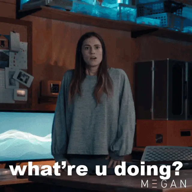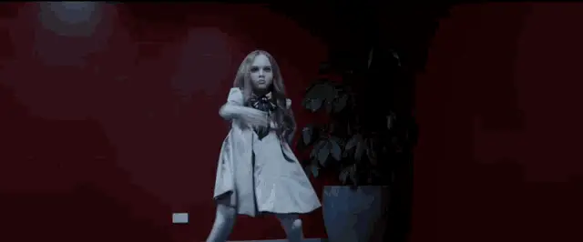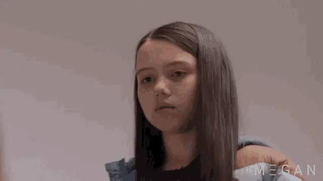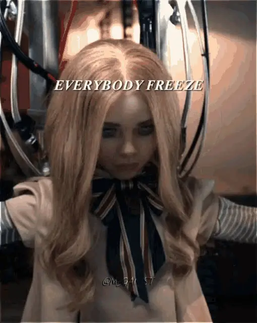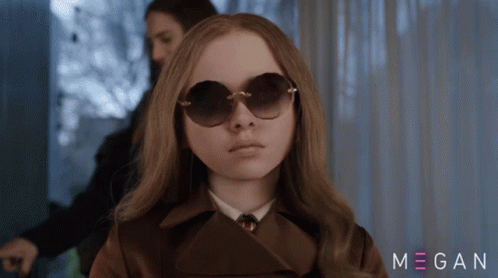 M3gan, portrayed by Amie Donald, dramatically removes her sunglasses, revealing her striking blue eyes.