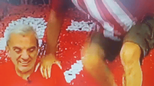 Takis Tsoukalas smiles broadly while lying on a vibrant red surface, with another person's legs visible.