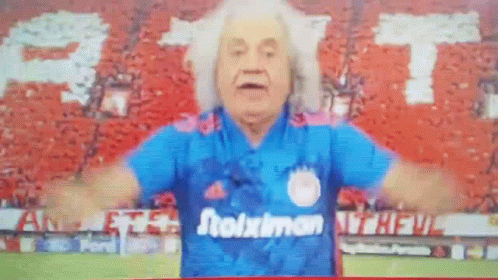 Takis Tsoukalas, the famous Greek sports commentator, enthusiastically waving his arms while wearing an Olympiacos shirt.
