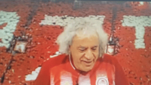 Takis Tsoukalas, a man with white curly hair, passionately shouting while wearing a red and white striped shirt.