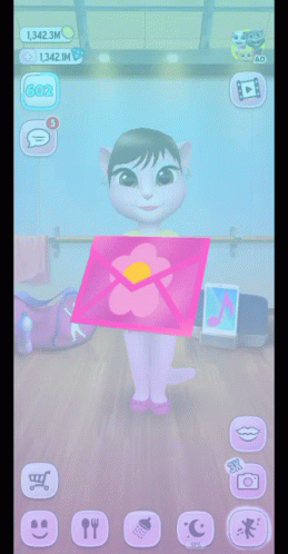A pop-up advertisement for a dance event appears in the My Talking Angela mobile game, offering special rewards.