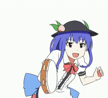 A cute cartoon girl with blue hair happily plays a tambourine, shaking it rhythmically.