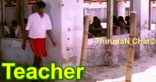 Thirudan Vadivelu, dressed in a white shirt and red shorts, portrays a teacher in a humorous scene, with 'Teacher' text visible.