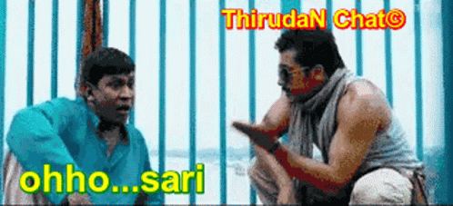 Vadivelu and Surya in a funny scene from Thirudan Chat, reacting to a situation with 'Oh... Okay'.