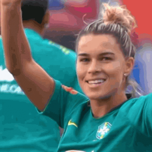 Brazilian footballer Tamires Tata makes a heart gesture, smiling at the camera in her national team jersey.