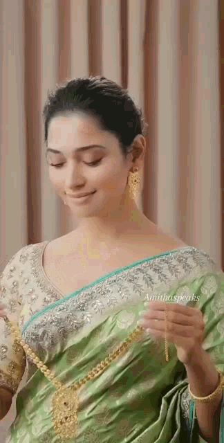 Tammanah, in a green saree, elegantly puts on a stunning gold necklace.