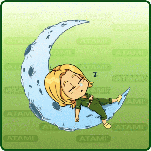 Tammy Atami, a cartoon girl, peacefully sleeps on a crescent moon, with 'Zzz' indicating deep sleep.